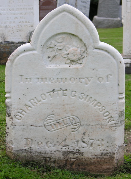 - [S3397] Cemetery Marker - Charlotte Simpson. Charlotte Simpson, Tombstone inscription; David A. Walker, 2006.