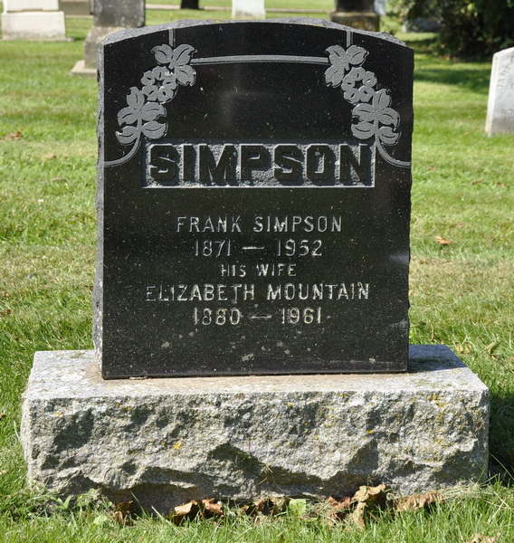 | Burial | He was buried in the Peoples Cemetery, Malpeque, Prince County, Prince Edward Island, Canada, 46.52977, -63.68762G. SIMPSON / Frank Simpson / 1871 - 1952 / His Wife / Elizabeth Mountain / 1880 - 1961.1 Tombstone, Frank Simpson (1871-1952), his wife Elizabeth Mountain (1880-1961). Peoples Cemetery, Malpeque, Prince County, Prince Edward Island, Canada. |