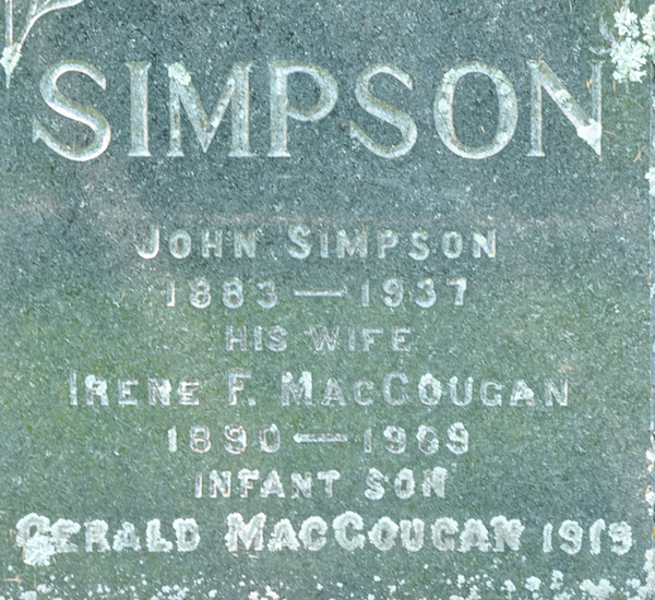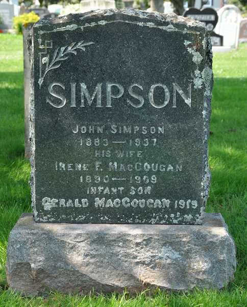 | Burial | She was buried in Peoples Cemetery; stone #35, Malpeque, Prince County, Prince Edward Island, Canada, 46.52997, -63.68671G. Inscription: SIMPSON / John Simpson / 1883 - 1937 / His Wife / Irene F. MacGougan / 1890 - 1989 / Infant Son / Gerald MacGougan - 1919.1 Tombstone, John Simpson (1883-1937), his wife Irene F. MacGougan (1890-1989), their son Gerald MacGougan Simpson (- 1919). Peoples Cemetery, Malpeque, Prince County, Prince Edward Island, Canada.  Inscription detail. |