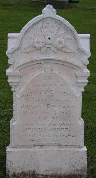 | Burial | She was buried in Cavendish Cemetery, Cavendish, Queens County, Prince Edward Island, CanadaG. Inscription: In / Memory of / Louisa Jane McEwen / Beloved wife of / Junius Simpson / Died Oct. 7, 1891. / AEt 51. / Also her daughter / Jemima Janet / Died Apr. 18, 1876. / Aged 12 mo's.1 Tombstone, Louisa Jane McEwen (1840-1891), her daughter Jemima Janet Simpson (1875-1876). Cavendish Cemetery, Queens County, Prince Edward Island, Canada. |