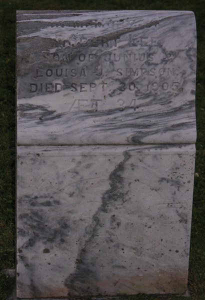 | Burial | He was buried in Cavendish Cemetery, Cavendish, Queens County, Prince Edward Island, CanadaG. Inscription: Robert Lee / Son of Junius & / Louisa J. Simpson / Died Sept. 30, 1905, / AET. 34.1 Tombstone, Robert Lee Simpson (1870-1905). Cavendish Cemetery, Queens County, Prince Edward Island, Canada. |