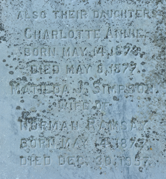 | Burial | She was buried in the Peoples Cemetery, Malpeque, Prince County, Prince Edward Island, Canada, 46.52996, -63.68667G. Inscription: William McN. Simpson / Born Sept. 27, 1832, / Did Feb. 18, 1916. / His wife / Sophia Clark, / Born Dec. 12, 1842, / Died April 9, 1935.Back: Also their daughters / Charlotte Annie / Born May 14, 1873 / Died May 8, 1887 / Matilda J. Simpson / Wife of / Norman Ramsay / Born May 14, 1873 / Died Dec. 30, 1957.1 Tombstone, William McNeill Simpson (1832-1916), wife Sophia Amelia Clark (1842-1935), their daughters Charlotte Annie (1873-1887) and Matilda Jane (1873-1957). Peoples Cemetery, Malpeque, Prince County, Prince Edward Island, Canada.  Front inscription detail.  Back inscription detail. |