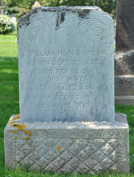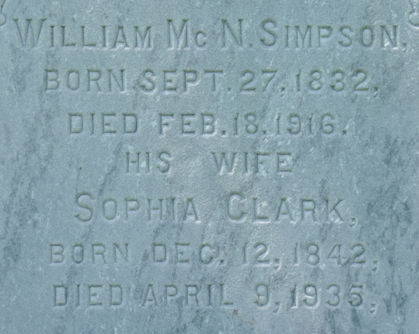 - [S4744] Cemetery Marker - William McNeill Simpson. William McNeill Simpson & Sophia Amelia Clark, Cemetery Marker; David A. Walker, 21 July 2010.