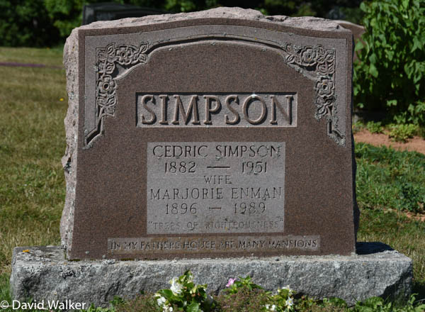 | Principal 2 | She witnessed the burial of Cedric Simpson and Marjorie I. Enman in Cavendish Cemetery, Cavendish, Queens County, Prince Edward Island, Canada, 46.49028, -63.37849G.1,2 Marker, Cedric Simpson (1882-1951), his wife Marjorie Enman (1896-1989). Cavendish Cemetery, Cavendish, Queens County, Prince Edward Island, Canada. |