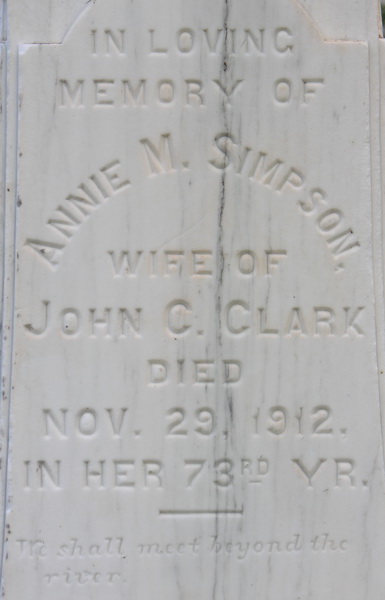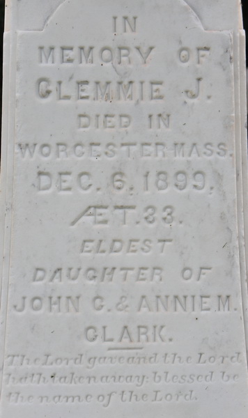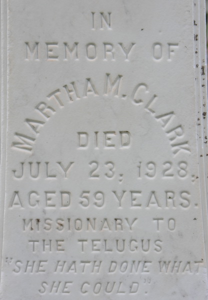 | Burial | She was buried in Cavendish Cemetery, Cavendish, Queens County, Prince Edward Island, Canada, 46.491767, -63.378917G. Inscription: John C. Clark / born at / Cavendish P.E.I. / Nov. 11, 1835 / died at Kamloops B.C. / Oct. 27, 1914. / The memory of the just is / blessed. Left Side: In / memory of / Martha M. Clark / died / July 23, 1928, / Aged 59 years. / Missionary to / the Telugas / "She hath done what / she could." Right Side: In / memory of / Clemmie J. / died in / Worcester Mass. / Dec. 6, 1899 / AET. 33. / Eldest daughter of / John C. & Annie M. / Clark. / -- / The Lord gave and the Lord / hath taken away; blessed be / the name of the Lord. Back: In loving / memory of / Annie M. Simpson / wife of John C. Clark / died / Nov. 29, 1912 / in her 73rd yr. / We shall meet beyond the river. Footstones: M.M.C. (upside down), J.C.C., A.M.S.C., C.J.C.1 Tombstone, John Cavendish Clark (1835-1914), his wife Annie M. Simpson (1839-1912), their daughters Martha M. Clark (1868-1928), Clemmie J. Clark (1866-1899). Cavendish Cemetery, Queens County, Prince Edward Island, Canada.  Front inscription detail.  Left inscription detail.  Right inscription detail.  Back inscription detail. |
