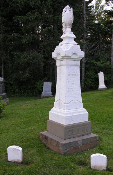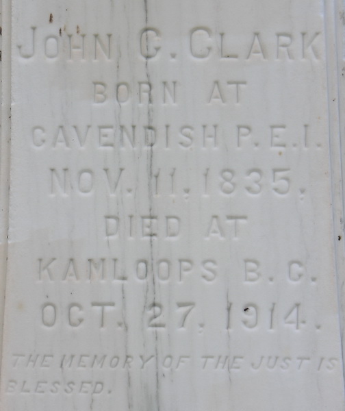 | Burial | He was buried in Cavendish Cemetery, Cavendish, Queens County, Prince Edward Island, Canada, 46.491767, -63.378917G. Inscription: John C. Clark / born at / Cavendish P.E.I. / Nov. 11, 1835 / died at Kamloops B.C. / Oct. 27, 1914. / The memory of the just is / blessed. Left Side: In / memory of / Martha M. Clark / died / July 23, 1928, / Aged 59 years. / Missionary to / the Telugas / "She hath done what / she could." Right Side: In / memory of / Clemmie J. / died in / Worcester Mass. / Dec. 6, 1899 / AET. 33. / Eldest daughter of / John C. & Annie M. / Clark. / -- / The Lord gave and the Lord / hath taken away; blessed be / the name of the Lord. Back: In loving / memory of / Annie M. Simpson / wife of John C. Clark / died / Nov. 29, 1912 / in her 73rd yr. / We shall meet beyond the river. Footstones: M.M.C. (upside down), J.C.C., A.M.S.C., C.J.C.1 Tombstone, John Cavendish Clark (1835-1914), his wife Annie M. Simpson (1839-1912), their daughters Martha M. Clark (1868-1928), Clemmie J. Clark (1866-1899). Cavendish Cemetery, Queens County, Prince Edward Island, Canada.  Front inscription detail.  Left inscription detail.  Right inscription detail.  Back inscription detail. |