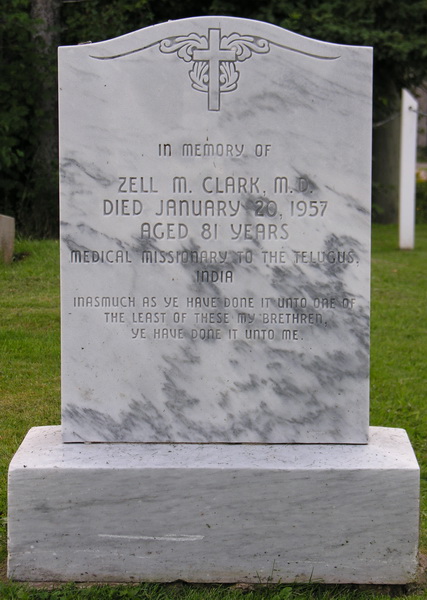 | Burial | She was buried in Cavendish Cemetery, Cavendish, Queens County, Prince Edward Island, Canada, 46.491767, -63.378917G. Inscription: In memory of / Zell M. Clark, M.D. / died Jan. 20, 1957 / Aged 81 years / Medical missionary to the Telugas / India / Inasmuch as ye have done it unto one of / the least of these my brethren, / ye have done it unto me.1 Tombstone, Zella M. Clark (1875-1959), Cavendish Cemetery, Queens County, Prince Edward Island, Canada. |