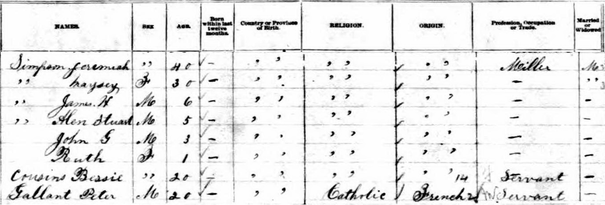 | Witness | He was enumerated on the census in 1881 in the household of Jeremiah Simpson in Lot 22, Queens County, Prince Edward Island, CanadaG. included in the household with Jeremiah (age 40) were his wife Maysie Clark (age 30), children James (age 6), Allan Stuart (age 5), John (age 3) & Ruth (age 1), Bessie Cousins (age 20) & Peter Gallant (age 20), both servants. Jeremiah was a miller. The family religion was Presbyterian.1 1881 Canada Census, Lot 22, Queens County, Prince Edward Island. Household of Jeremiah Simpson, his wife Maysie Clark, their children James, Allan Stuart, John & Ruth, and two servants. |