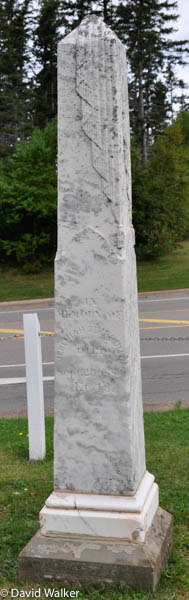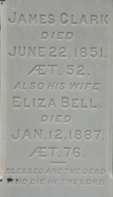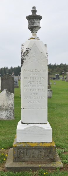 | Burial | He was buried in Geddie Memorial Cemetery, Springbrook, Queens County, Prince Edward Island, 46.49425, -63.50710G. Inscription: James Clark / Died / June 22, 1851 / ÆT. 52. / Also His Wife / Eliza Bell / Died / Jan 12, 1887, / ÆT. 76. / Blessed are the Dead / Who Die in the LordLeft: And / Their Daughter / Mary Ann, / Died / Jan. 1, 1901 / ÆT. 60.1,2 Tombstone, James Clark (1799-1851), his wife Eliza Bell (1811-1887), their daughter Mary Ann Clark (1841-1901). Geddie Memorial Cemetery, Springbrook, Queens County, Prince Edward Island, Canada.  Front inscription detail.  Left inscription detail. |