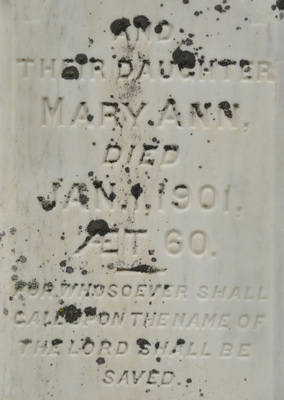 | Burial | She was buried in Geddie Memorial Cemetery, Springbrook, Queens County, Prince Edward Island, Canada, 46.49425, -63.50710G. Inscription: James Clark / Died / June 22, 1851 / ÆT. 52. / Also His Wife / Eliza Bell / Died / Jan 12, 1887, / ÆT. 76. / Blessed are the Dead / Who Die in the LordLeft: And / Their Daughter / Mary Ann, / Died / Jan. 1, 1901 / ÆT. 60.2,1 Tombstone, James Clark (1799-1851), his wife Eliza Bell (1811-1887), their daughter Mary Ann Clark (1841-1901). Geddie Memorial Cemetery, Springbrook, Queens County, Prince Edward Island, Canada.  Front inscription detail.  Left inscription detail. |