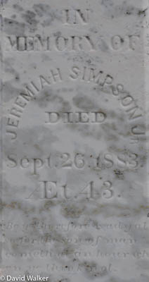 Inscription: In / Memory of / Jeremiah Simpson Jr. / Died / Sept. 26, 1883 / Æt. 43. / Be ye therefore ready al / so for the son of man / cometh at an hour wh / en ye think not Right: At Rest / Maysie W. Clark / Relict of the late / Jeremiah Simpson Jr. / 1851-1939.2  Tombstone, Jeremiah Simpson Jr. (1841-1883), his wife Maysie Clark (1851-1939) Community Cemetery, Cavendish, Queens County, Prince Edward Island, Canada.  Front inscription.  Right inscription.