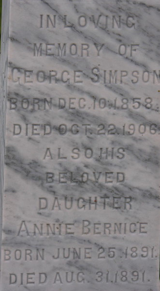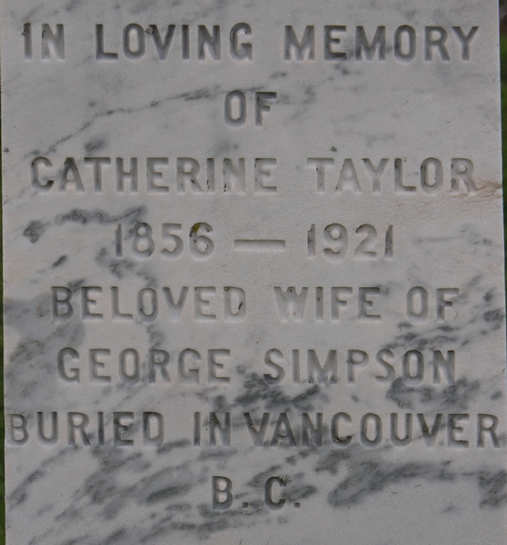 | Interred | She was buried in the plot of Hon. George Woodside Simpson, in Cavendish Cemetery, Cavendish, Queens County, Prince Edward Island, CanadaG. Inscription: In Loving / Memory of / George Simpson / Born Dec. 10, 1858. / Died Oct. 22, 1906. / Also His / Beloved / Daughter / Annie Bernice / Born June 25, 1891. / Died Aug. 31, 1891.Left: In Memory of / Howard Simpson / 1851 - 1925 / A Beloved BrotherRight: In Loving Memory / of / Catherine Taylor / 1856 - 1921 / Beloved Wife of / George Simpson / Buried in Vancouver / B.B.2 Tombstone, George Simpson (1858-1906), his wife Catherine Taylor (1856-1921), their daughter Annie Bernice (1891-1891), George's brother Howard Simpson (1851-1925). Cavendish Cemetery, Queens County, Prince Edward Island, Canada.  Front inscription detail.  Right inscription detail.  Left inscription detail. |