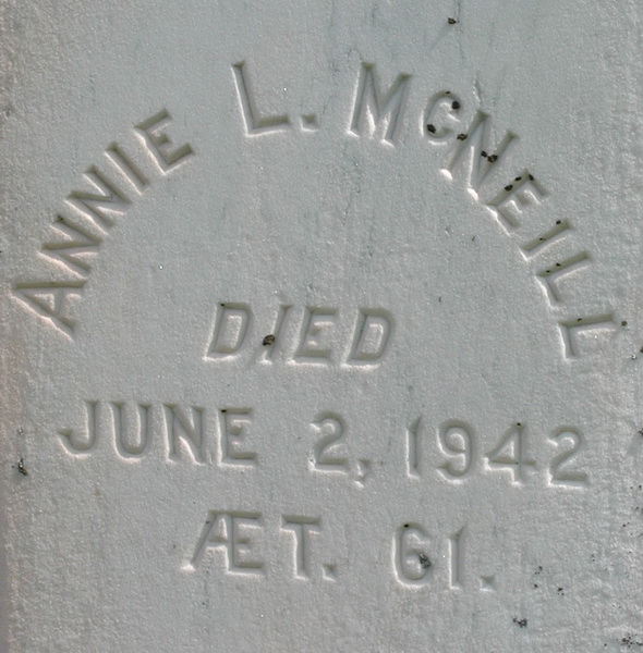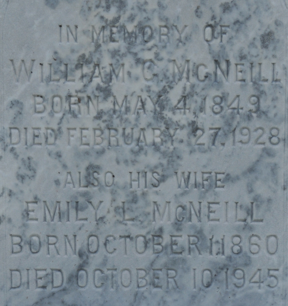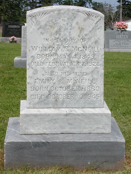 | Burial | She was buried in Nazarene United Cemetery, Elmsdale, Prince County, Prince Edward Island, Canada, 46.82209, -64.13636G. white marble tombstone. Inscription: In Memory of / William C. McNeill / Born May 4, 1849 / Died February 27, 1928 / Also His Wife / Emily L. McNeill / Born October 1, 1860 / Died October 10, 1945 / MCNEILL.1 White marble tombstone, William C. McNeill & Emily L. McNeill. Nazarene & United Church Cemetery, Elmsdale, Prince County, Prince Edward Island, Canada. Inscription: In Memory of / William C. McNeill / Born May 4, 1849 / Died February 27, 1928 / Also His Wife / Emily L. McNeill / Born October 1, 1860 / Died October 10, 1945 / MCNEILL.  Front inscription detail |
