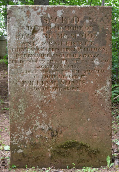 John and Sarah's stones are side by side. Inscription: Sacred to the memory of / John Adams, Senior / and Sarah, his wife / who emigrated from Milltown, / Derbyshire, England, A.D. 1774. / He departed this life the 7th of May 1815 / aged 81 years. On the bottom of John's stone it reads: "These two stones are erected in their memory by William Adams, son of the above".1,2  Tombstone, John Adams Sr. (1734-1815). Yankee Hill Cemetery, French River, Queens County, Prince Edward Island, Canada.