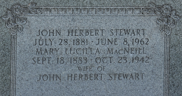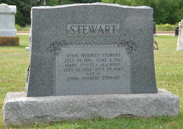 | Burial | He was buried in Nazarene United Church Cemetery, Elmsdale, Prince County, Prince Edward Island, Canada, 46.82202, -64.13668G. stone #195Inscription: STEWART / John Herbert Stewart / July 28, 1881 - June 8, 1962 / Mary Lucilla MacNeill / Sept. 18, 1883 - Oct. 23, 1942 / Wife of / John Herbert Stewart.2 Front inscription detail  Tombstone, John Herbert Stewart (1881-1962), his wife Mary Lucilla MacNeill (1883-1942). United Church Cemetery, Elmsdale, Prince County, Prince Edward Island, Canada. |