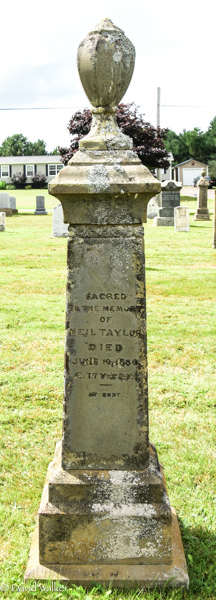 Inscription: Sacred / to the memory / of / Neil Taylor / Died / June 19, 1880 / Æ. 77 Yr's 9 M's / At RestLeft: Also / his wife / Lilly Ramsay / Died / Apr. 4, 1886 / ÆT. 69.1,2  Tombstone, Neil Taylor (1808-1880), his wife Lilly Ramsay (1817-1886). Peoples Cemetery, Malpeque, Prince County, Prince Edward Island, Canada.  Front inscription detail.  Left inscription detail.