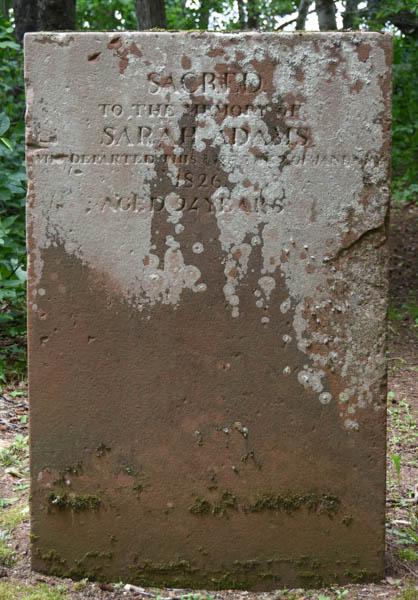 John and Sarah's stones are side by side. Inscription: Sacred to the Memory of / Sarah Adams / who departed this life / 3rd January 1826 / aged 94 years.1,2  Tombstone, Sarah (Harrison) Adams (ca.1745-1826). Yankee Hill Cemetery, French River, Queens County, Prince Edward Island, Canada.