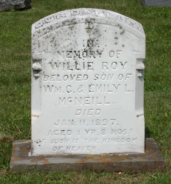 | Burial | He was buried in Nazarene United Church Cemetery, Elmsdale, Prince Edward Island, Canada, 46.82206, -64.13631G. white marble tombstone, #98. Inscription: Our Darling / In / Memory Of / Willie Roy / Beloved Son of / Wm. C. & Emily L. / McNeill / Died / Jan. 11, 1897, / Aged 1 Yr. 8 mos. / Of Such is the Kingdom / of Heaven.1 White marble tombstone, William Roy McNeill. Nazarene & United Church Cemetery, Elmsdale, Prince County, Prince Edward Island, Canada. Inscription: In / Memory Of / Willie Roy / Beloved Son of / Wm. C. & Emily L. / McNeill / Died / Jan. 11, 1897, / Aged 1 Yr. 8 mos. / Of Such is the Kingdom / of Heaven. |