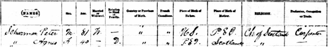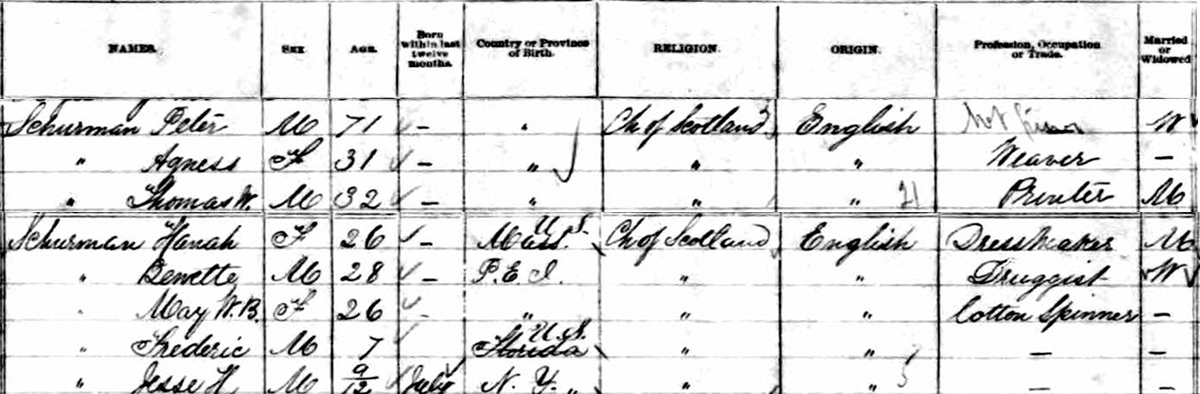 | Census | Peter Schurman was head of the household in the census in 1881 in Lot 27, Prince County, Prince Edward IslandG. included in the household were Peter's daughter Agnes (age 31, weaver), son Bennette Peter, age 28, widowed, druggist), daughter May/Mary (age 26, cotton spinner), son Thomas (age 32, printer), his wife Hannah (Roper, age 26, dressmaker), their children Frederic (age 7) and Jesse H. (age 9 months). Peter was a widower at this time, occupation "not given". Everyone in the household was a member of the Church of Scotland.2 1881 Canada Census, Lot 27, Prince County, Prince Edward Island. Household of Peter Schurman (widower), son Peter Bonnet/Bennet, daughters Agnes & May/Mary, son Thomas & his wife Hannah (Roper), and their children Frederic & Jesse. |