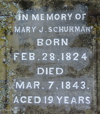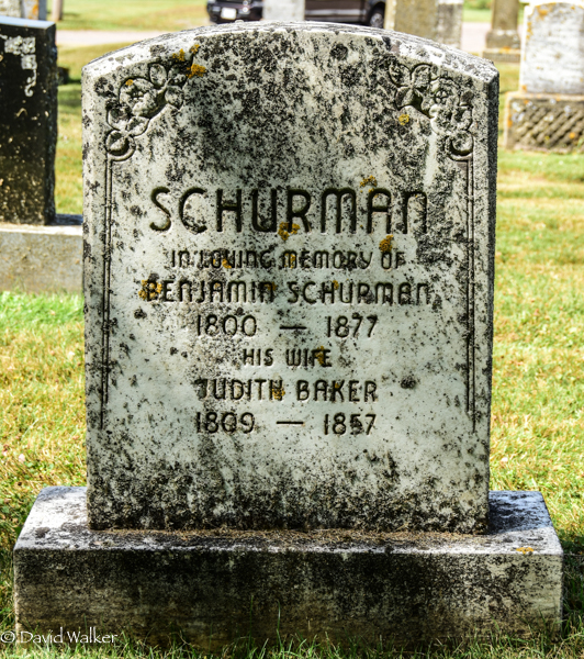 Inscription: In Memory of / Caleb Schurman / Died / Dec. 25, 1855. / Aged 74 Y'rs / Also / Mary His Wife / Died / July 12, 1872 / Aged 83 Y'rsLeft: In Memory of / Mary J. Schurman / Born Feb. 28, 1824, / Died / Mar. 7, 1843, / Aged 19 Years.2,3  Tombstone, Caleb Schurman (1782-1855), his wife Mary Lefurgey (1789-1872), their daughter Mary Jane Schurman (1824-1843). United Baptist Cemetery, Central Bedeque, Prince County, Prince Edward Island, Canada.  Front inscription detail.  Left inscription detail.