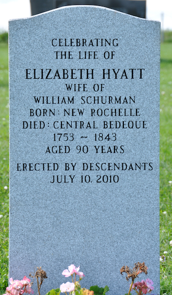 | Burial | She was buried in North Bedeque Cemetery, North Bedeque, Prince County, Prince Edward Island, Canada, 46.36159, -63.72592G. Inscription: Celebrating / The Life of / Elizabeth Hyatt / Wife of / William Schurman / Born: New Rochelle / Died: Central Bedeque / 1753 - 1843 / Aged 90 Years / Erected by Descendants / July 10, 2010.3 Tombstone, Elizabeth Hyatt (1753-1843). North Bedeque Cemetery, North Bedeque, Prince County, Prince Edward Island. |
