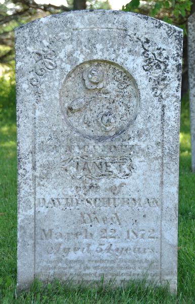 Inscription: In memory of / Janet / wife of / David Schurman / Died / March 22, 1872, / Aged 54 years / [script].2  Tombstone, Janet Glover (1818-1872). Wilmot Valley Cemetery, Prince County, Prince Edward Island, Canada.