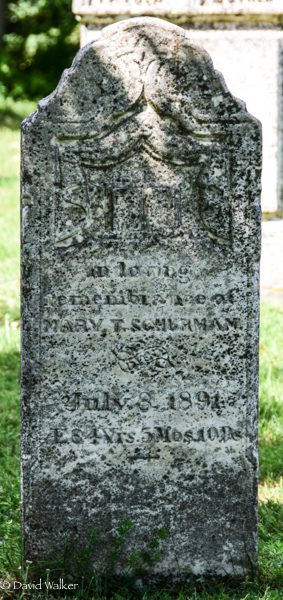 Inscription: In loving / remembrance of / Mary T. Schurman / Died / July 8, 1891 / Æ 84 Yrs. 5 Mos. 10 Ds.1  Tombstone, Mary T. Schurman (1808-1891). Church of Scotland Cemetery, Wilmot Valley, Prince County, Prince Edward Island, Canada.