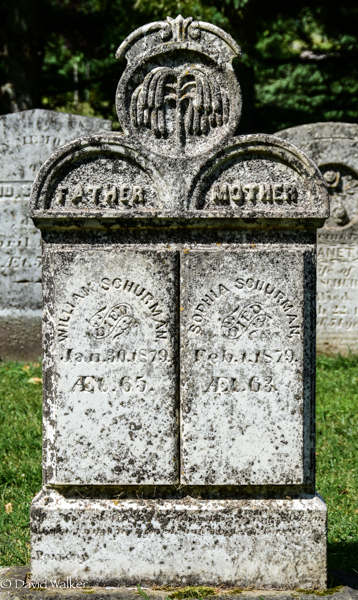 Inscription: Father / William Schurman / Died / Jan. 30, 1879 / Æt. 65. | Mother / Sophia Schurman / Died / Feb. 1, 1879, / Æt. 63.2  Tombstone, William Schurman (1813-1879), his wife Sophia Schurman (1813-1879). Church of Scotland Cemetery, Wilmot Valley, Prince County, Prince Edward Island, Canada.