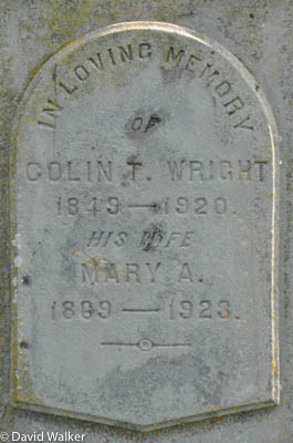 Inscription: In memory / of / William Wright / died July 24, 1872, / Æt. 72. / Also his wife / Sarah B. / died June 3, 1875 / Æt. 71.Back: In Loving Memory / of / Colin T. Wright / 1849 - 1920 / His Wife / Mary A. / 1869 - 1923.3,4  Tombstone, William Wright (c1800-1872), his wife Sarah Bremble Schurman 1804-1875), their son Colin Wright (1849-1920), his wife Mary A. Campbell (1869-1923). United Church Cemetery (Bedeque Cemetery), Lower Bedeque, Prince County, Prince Edward Island, Canada.  Front inscription.  Back inscription.