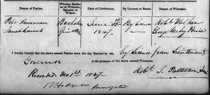 | Marriage | He married Janet Cairns daughter of Thomas Cairns and Agnes Wilson, on 15 June 1847, in the United Church, North Bedeque, Prince County, Prince Edward Island, 46.36518, -63.72410G. they were married "by license from Lieutenant Governor", by Rev. Robert S. Patterson, recorded 1 December 1847. Witnesses were Robert Walker and George Mabey Price.1 Marriage Registration, Peter Schurman & Janet Cairns. |