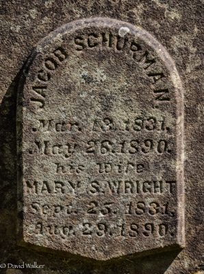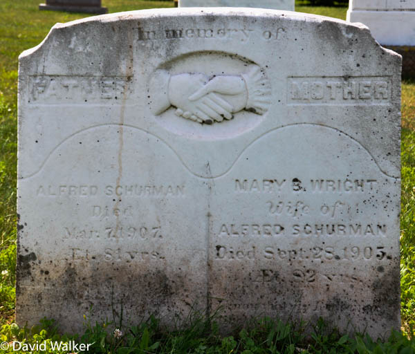 Inscription: In memory of / Father / Alfred Schurman / Died / Mar. 7, 1907. / ÆT. 81 yrs. | Mother / Mary B. Wright / Wife of / Alfred Schurman / Died Sept. 28, 1905. / ÆT. 82 yrs.3  Tombstone, Alfred Compton Schurman (1826-1907), his wife Mary Bremble Wright (1823-1905). United Church Cemetery (Bedeque Cemetery), Lower Bedeque, Prince County, Prince Edward Island, Canada.