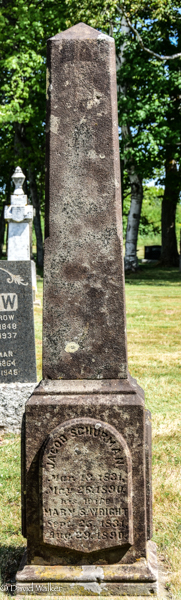Inscription: In Memory of / Caleb Schurman / Died / Dec. 25, 1855. / Aged 74 Y'rs / Also / Mary His Wife / Died / July 12, 1872 / Aged 83 Y'rsLeft: In Memory of / Mary J. Schurman / Born Feb. 28, 1824, / Died / Mar. 7, 1843, / Aged 19 Years.1,2  Tombstone, Caleb Schurman (1782-1855), his wife Mary Lefurgey (1789-1872), their daughter Mary Jane Schurman (1824-1843). United Baptist Cemetery, Central Bedeque, Prince County, Prince Edward Island, Canada.  Front inscription detail.  Left inscription detail.