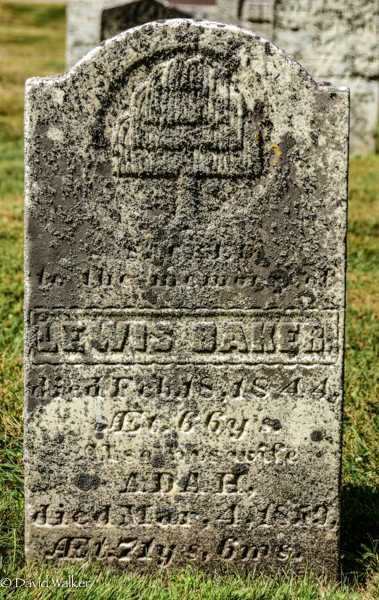 Inscription: Sacred / to the memory of / Lewis Baker / died Feb. 18, 1844, / Æt. 66 y's / Also his wife / Adah / died Mar. 4, 1859, / Æt. 71 y's, 6 m's.1,2  Tombstone, Lewis Baker (1778-1844), his wife Adah Farrow (1787-1859). United-Baptist Cemetery, Central Bedeque, Prince County, Prince Edward Island, Canada.