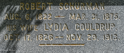 Inscription: Robert Schurman / Aug. 6, 1822 - Mar. 31, 1875. / His Wife Lydia Gouldrup / Oct. 17, 1826 - Nov. 29, 1913.1,2  Tombstone, Robert Schurman (1821-1875), his wife Lydia Gouldrup (1826-1913). United-Baptist Cemetery, Central Bedeque, Prince County, Prince Edward Island, Canada.  Front inscription detail.