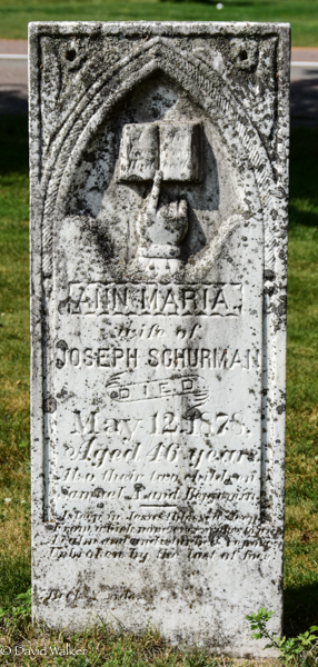 Inscription: Ann Maria / wife of / Joseph Schurman / Died / May 12, 1878. / Aged 46 years. / Also their two children / Samuel and Benjamin.1  Tombstone, Ann Maria (Rodd) Schurman (c1832-1878). Central Lot 16 United Church Cemetery, Prince County, Prince Edward Island, Canada.