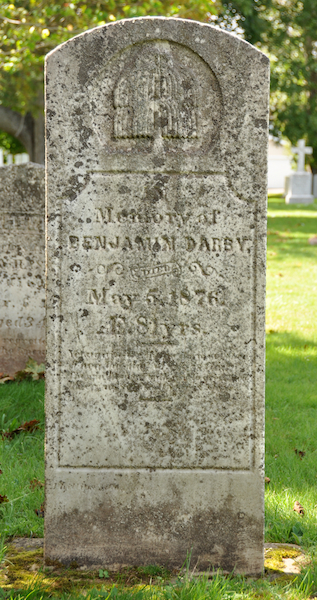 | Burial | He was buried in St. John's Anglican Church Cemetery, St. Eleanors, Prince County, Prince Edward Island, Canada, 46.41956, -63.81025G. Inscription: In / Memory of / Benjamin DArby / Died / May 5, 1876 / AE. 81 yrs.5 Front inscription detail.  Tombstone, Benjamin Darby Jr. (1795-1876). St. John's Anglican Church Cemetery, St. Eleanors, Prince County, Prince Edward Island, Canada. |