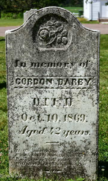 Inscription: In memory of / Gordon Darby / Died / Oct. 10, 1869, / Aged 42 years.1  Tombstone, Gordon Darby (1826-1869). United Baptist Cemetery, Central Bedeque, Prince County, Prince Edward Island, Canada.