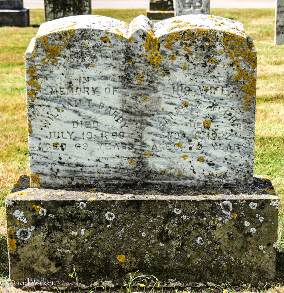 Inscription: In / Memory of / William T. Darby / Died / July 19, 1899 / Aged 69 Years | His Wife / Sarah A. Mobbs / Died / Nov. 8, 1932 / Aged 75 Years.1,2  Tombstone, William T. Darby (1830-1899), his second wife Sarah A. Mobbs (1857-1932). United-Baptist Cemetery, Central Bedeque, Prince County, Prince Edward Island, Canada.