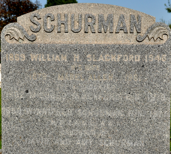 Inscription: SCHURMAN / Mary E. McEwen / 1846 - 1886 / Amy Dobson / 1858 - 1890 / Wives of David Schurman / Winnie Schurman / 1869 - 1890 / Wife of W. H. Pentz Back: SCHURMAN / 1869 William H. Slackford 1945 / His Wife / 1879 Mabel Allen 1981 / Their Daughter / 1902 Mildred Slackford R.N. 1979 / 1890 Winnifred Schurman R.N. 1977 / N/S .A.M.C. WWI / Daughter of / David and Amy Schurman.1  Tombstone, Mary E. McEwen (1846-1885), Amy Dobson (1858-1890), wives of David Schurman, Winnie Schurman (1869-1890), daughter of David Schurman and Mary McEwen, William H. Slackford (1869-1945), his wife Mabel Allen (1879-1981), their daughter Mildred Slackford (1902-1979), Winnifred Schurman (1890-1977), daughter of David & Amy Schurman. People's Cemetery, Summerside, Prince County, Prince Edward Island, Canada.  Back inscription detail.