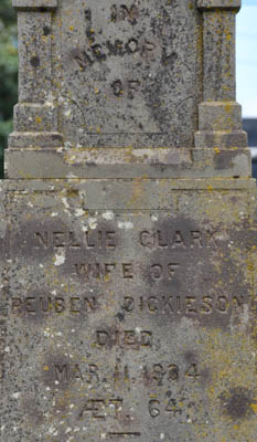 Inscription: In / Memory / of / Margaret Ann Lefurgey / Wife of / Charles W. Clark / Died / Died / March 8, 1899, / ÆT. 50.Right: In / Memory / of / Charles W. Clark / Died / Nov. 7, 1903. / ÆT. 60.Back: In / Memory / of / Nellie Clark / Wife of / Reuben Dickieson / Died / Mar. 11, 1934 / ÆT. 64.1  Tombstone, Charles W. Clark (1843-1903), his wife Margaret Ann Lefurgey (1847-1899), their daughter Nellie (1870-1934). Church of Scotland Cemetery, Wilmot Valley, Prince County, Prince Edward Island, Canada.  Front inscription.  Right inscription.  Back inscription.