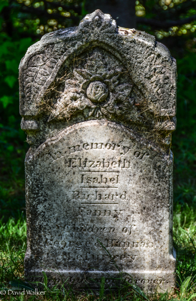 Inscription: In memory of / Elizabeth / -------/ Isabel / ------ / Richard / ------ / Fanny / Children of / George & Hannah / Lefurgey.1  Tombstone, Elizabeth Lefurgey (1832-1842), her siblings Isabel (1836-1842), Richard (1849-1856) and Fanny (1856-1857), children of George Lefurgey and Hannah Baker. Church of Scotland Cemetery, Wilmot Valley, Prince County, Prince Edward Island, Canada.