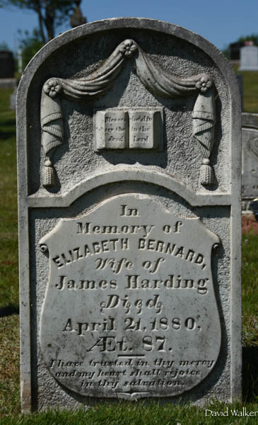 Inscription: In / Memory of / Elizabeth Harding / Wife of / James Harding / Died / April 21, 1880, Æt. 87. / I have trusted in thy mercy / and my heart shall rejoice / in thy salvation.2  Tombstone, Elizabeth Bernard (1793-1880). St. Thomas Anglican Cemetery, Springbrook, Queens County, Prince Edward Island, Canada.