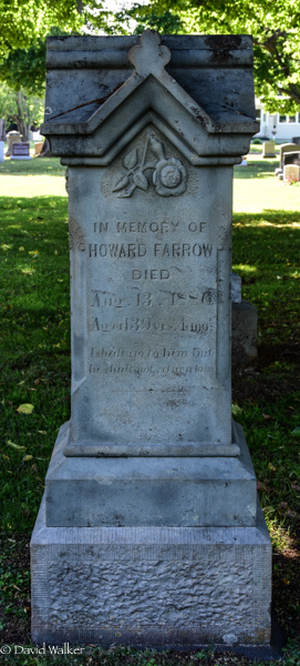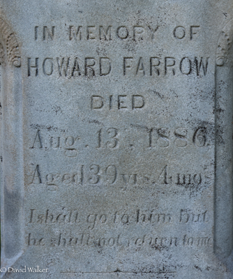 Inscription: In Memory of / Howard Farrow / Died / Aug. 13, 1886, / Aged 39 yrs. 4 mo.1  Cemetery marker, Howard Farrow (1847-1886). Peoples Cemetery, Summerside, Prince County, Prince Edward Island, Canada.  Front inscription detail.