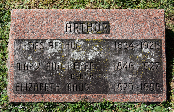 Inscription: ARTHUR / James Arthur 1834 - 1926 / His Wife / Mary Ann Baker 1846 - 1927 / Daughter / Elizabeth Maud 1879 - 1895.1  Cemetery Marker: James Arthur (1834-1926), his wife Mary Ann Baker (1846-1927), their daughter Elizabeth Maud (1879-1895). St. Thomas Anglican Church Cemetery, Springbrook, Queens County, Prince Edward Island, Canada.