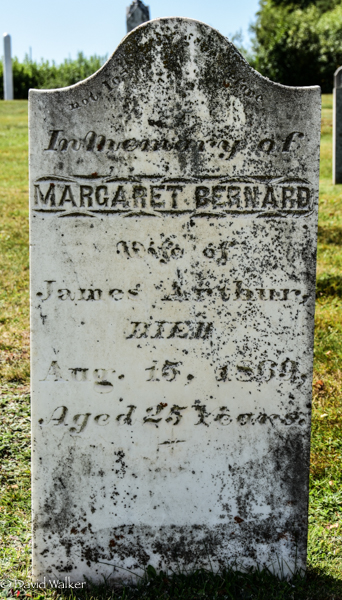 Inscription: In Memory of / Margaret Bernard / Wife of / James Arthur / Died / Aug. 15, 1869 / Aged 25 Years.2,3  Cemetery Marker: Margaret Bernard (c1844-1869). St. Thomas Anglican Church Cemetery, Springbrook, Queens County, Prince Edward Island, Canada.
