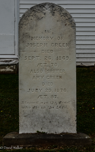 Inscription: In / Memory of / Joseph Green / Died / Sept. 26, 1869, / ÆT. 70. / Also Sister / Amy Green / Died / July 29, 1876, / ÆT. 87. / Blessed are the dead / who die in the Lord.2  Tombstone, Joseph Green (1799-1869), his sister Amy Green (1842-1976). St. John's Anglican Cemetery, St. Eleanors, Prince County, Prince Edward Island, Canada.
