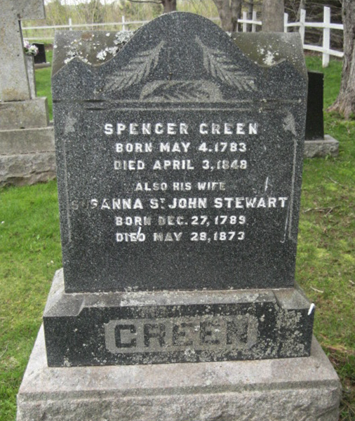 Inscription: Spencer Green / Born May 4, 1783 / Died April 3, 1848 / Also His Wife / Susanna St. John Stewart / Born Dec. 27, 1789 / Died May 28, 1873.2  Marker, Spencer Green (1783-1848), his wife Susanna St. John Stewart (1789-1873). Photo courtesy of ancestry.com.