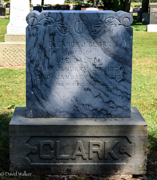 Inscription: Eleanor J. Clark / Wife of / J. E. Dalton / Born January 28, 1878 / Died January 16, 1913 / He Giveth His Beloved Sleep / CLARK.1,2  Cemetery marker, Eleanor Jane Clark (1878-1913). Peoples Cemetery, Summerside, Prince County, Prince Edward Island, Canada.