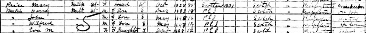 | Witness | Wilfred Mutch was enumerated on the census in 1911 in the household of Mary Cairns in Milk St., Summerside, Prince County, Prince Edward Island, CanadaG. Mary was a widow at this census, head of household, with four grandchildren living with her, children of William Mutch and her daughter Agnes, Harry (age 18), John (age 16), Wilfred (age 17) and Eva (age 12). Mary was a homekeeper, Harry did odd jobs, and Eva was in school. The family religion was Presbyterian.3 1881 Canada Census, Summerside, Prince County, Prince Edward Island, household of widow Mary (Cairns) Price, her grandchildren (children of Agnes & William Mutch), Harry, John, Wilfred and Eva. |