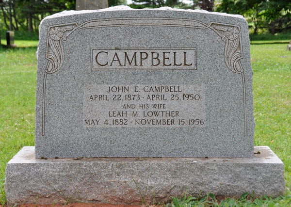Inscription: CAMPBELL / John E. Campbell / April 22, 1873 - April 25, 1950 / And His Wife / Leah M. Lowther / May 4, 1882 - November 15, 1956.2,1  Tombstone, John E. Campbell (1873-1950), his wife Leah M. Lowther (1882-1956). Church of Scotland Cemetery, Wilmot Valley, Prince County, Prince Edward Island, Canada.